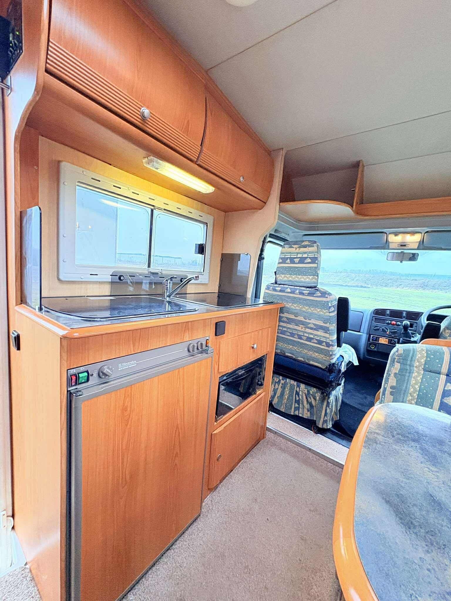 Kitchen: Equipped with a 3-burner gas hob, an oven/grill, a sink with a mixer tap, and a 3-way fridge.